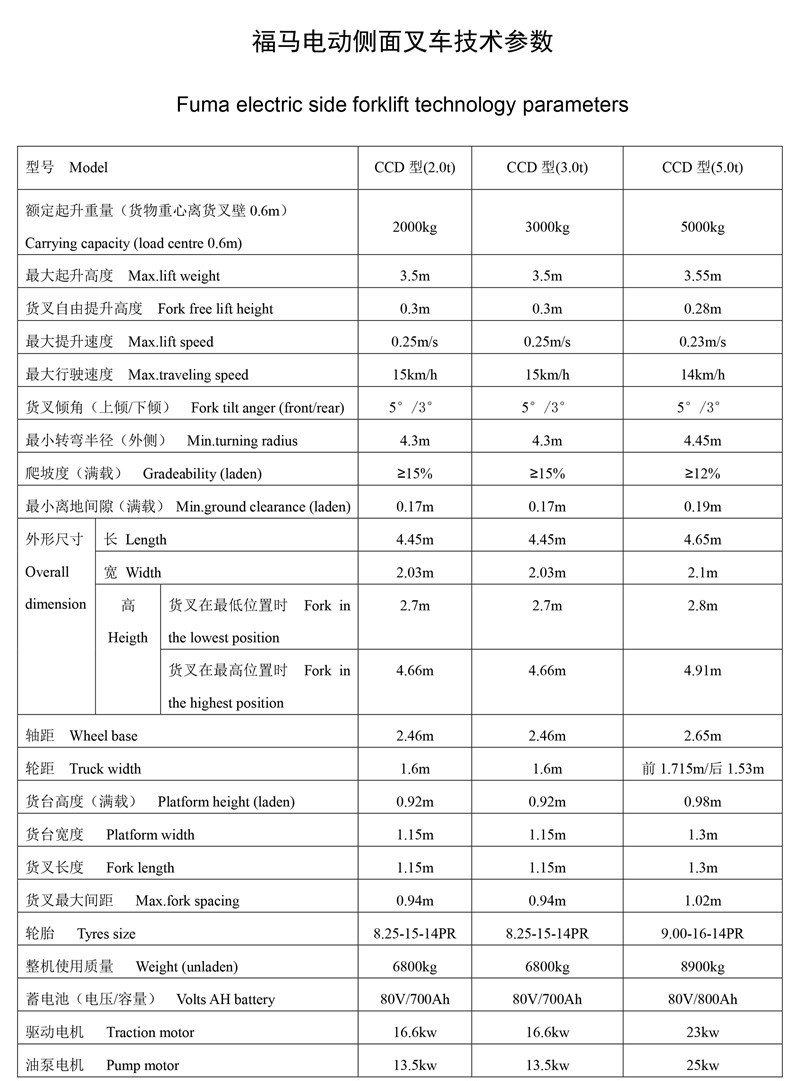 Fuma type CCD 2-3 tons series electric side forklift is the development of new products, developed on a 3 ton diesel forklift our side of the mature.